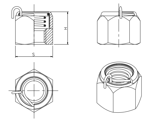 弹簧嵌件式防松螺母利用弹簧的张紧特性,在较小紧固力矩或无力矩状态依然具有良好的防松性能,经 1200 次横向振动试验后残余轴力不低于 70%。弹簧螺母本体材质为 304B 优质奥氏体不锈钢,性能等级为 A2-70,螺纹采用可靠防咬死工艺处理。