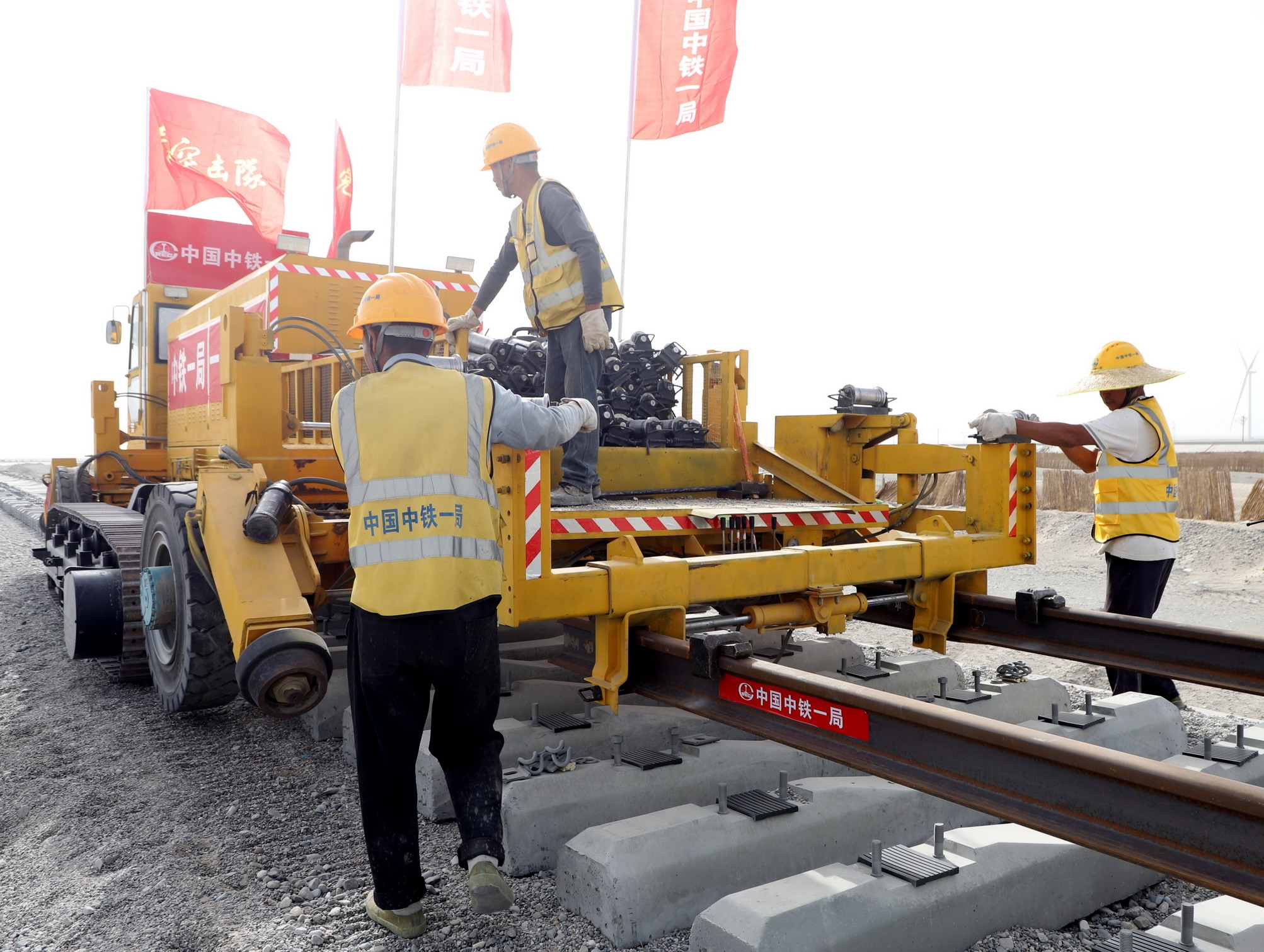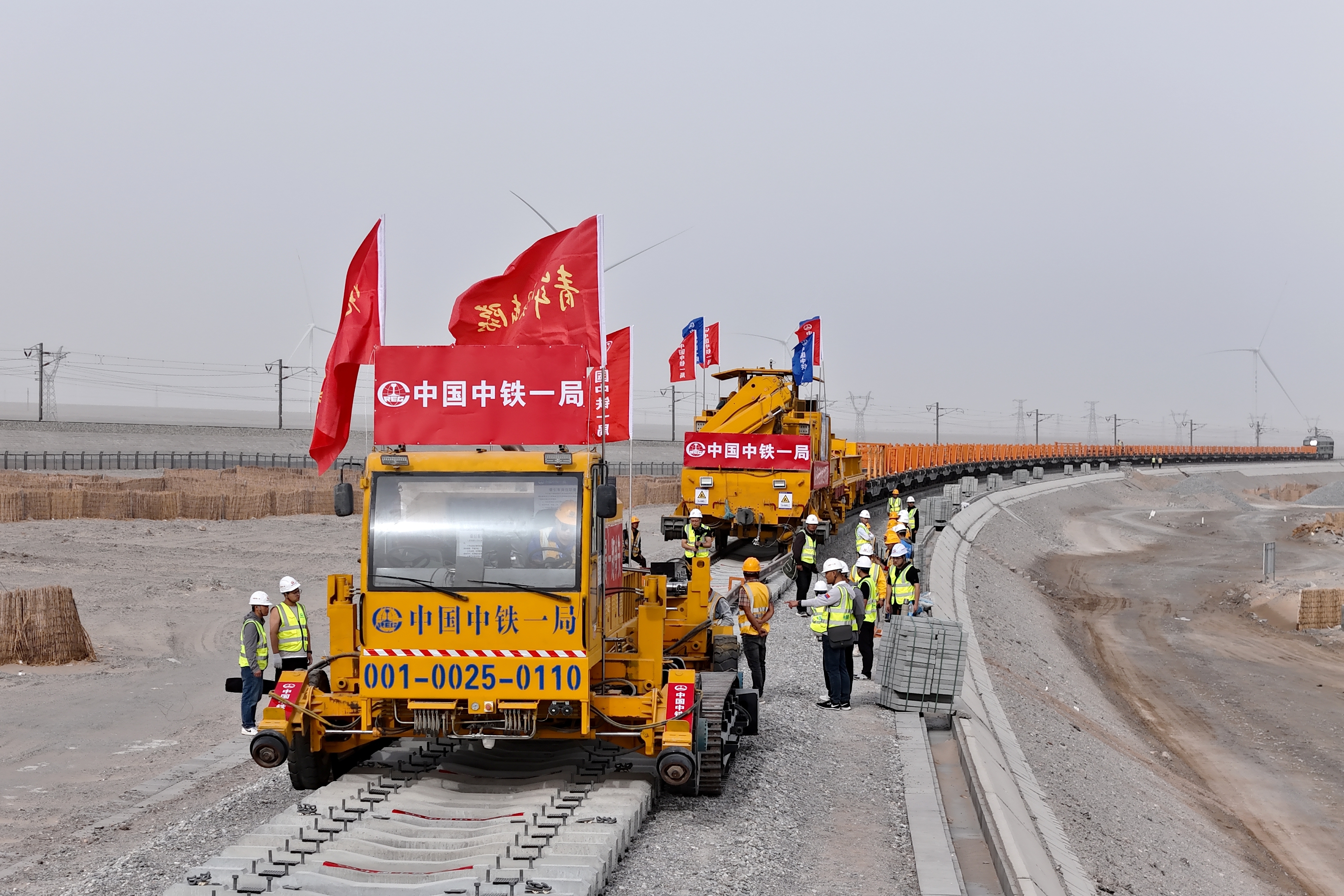 此次铺轨的米兰至罗布泊段为新建铁路线,全长237.73公里。中铁一局投入TCM60长轨铺设机组铺轨,该机组具有铺设速度快、安全性能好、铺设精度高等特点。自今年3月份复工复产以来,项目部以“智控平台+安全穿透式管理”为管理模式,克服了高温风沙天气、交叉作业干扰多等不利因素,及时与业主单位对接优化施工方案,先后实现87.5公里长轨顺利进场、单日预制3.5孔T梁、全线最长桥米兰河特大桥架梁贯通、14万根轨枕按期锚固完成等关键节点,为米兰至罗布泊段长轨铺设创造了有利条件。