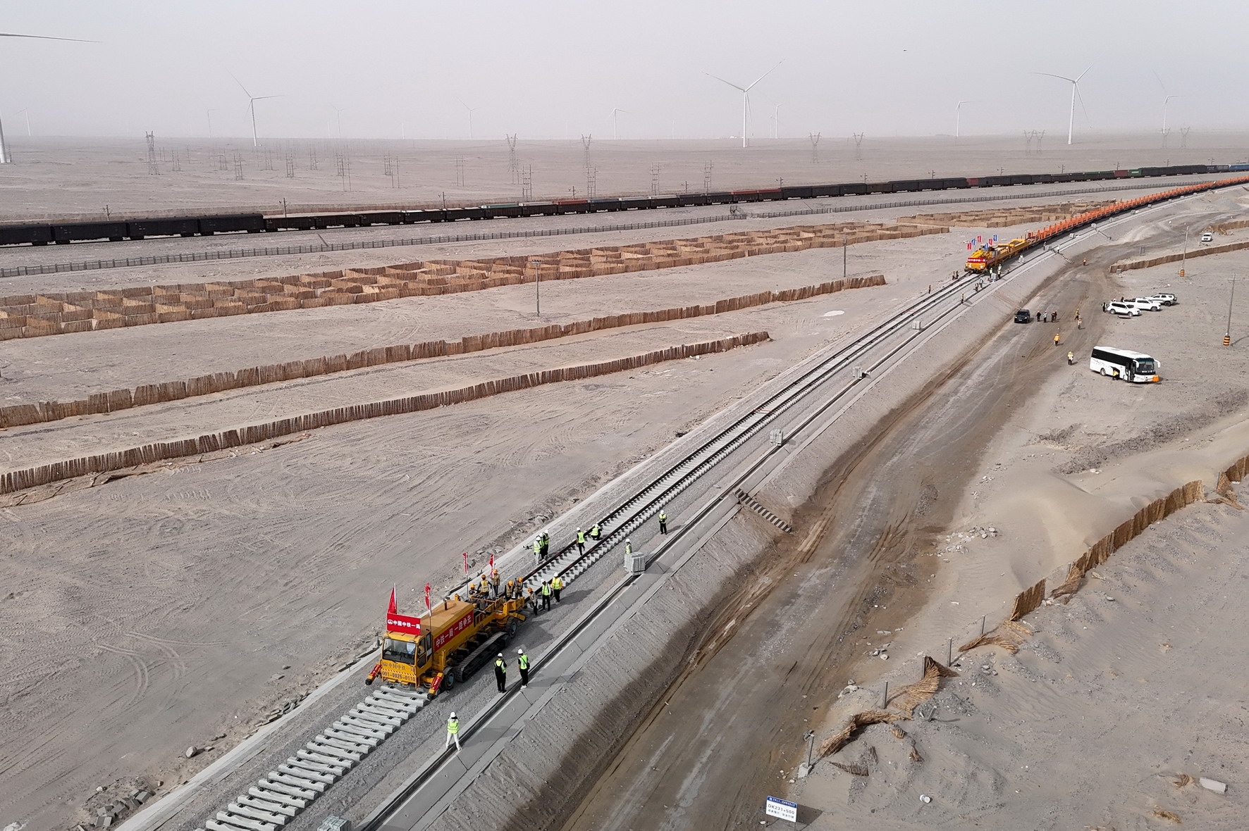罗若铁路全长297.73公里,设计时速120公里,线路东起哈罗铁路罗中站,穿越罗布泊干涸湖盆区、米兰遗址,在米兰镇接入格库铁路米兰站,沿格库铁路引入若羌站。中国中铁旗下中铁一局承担全线铺轨及制架简支T梁366孔等施工任务。其中,罗若铁路米兰至若羌段59.86公里,于2024年9月7日开始铺轨,并于2024年11月15日以优良率100%,“零问题”一次性通过动态验收并开通运营。