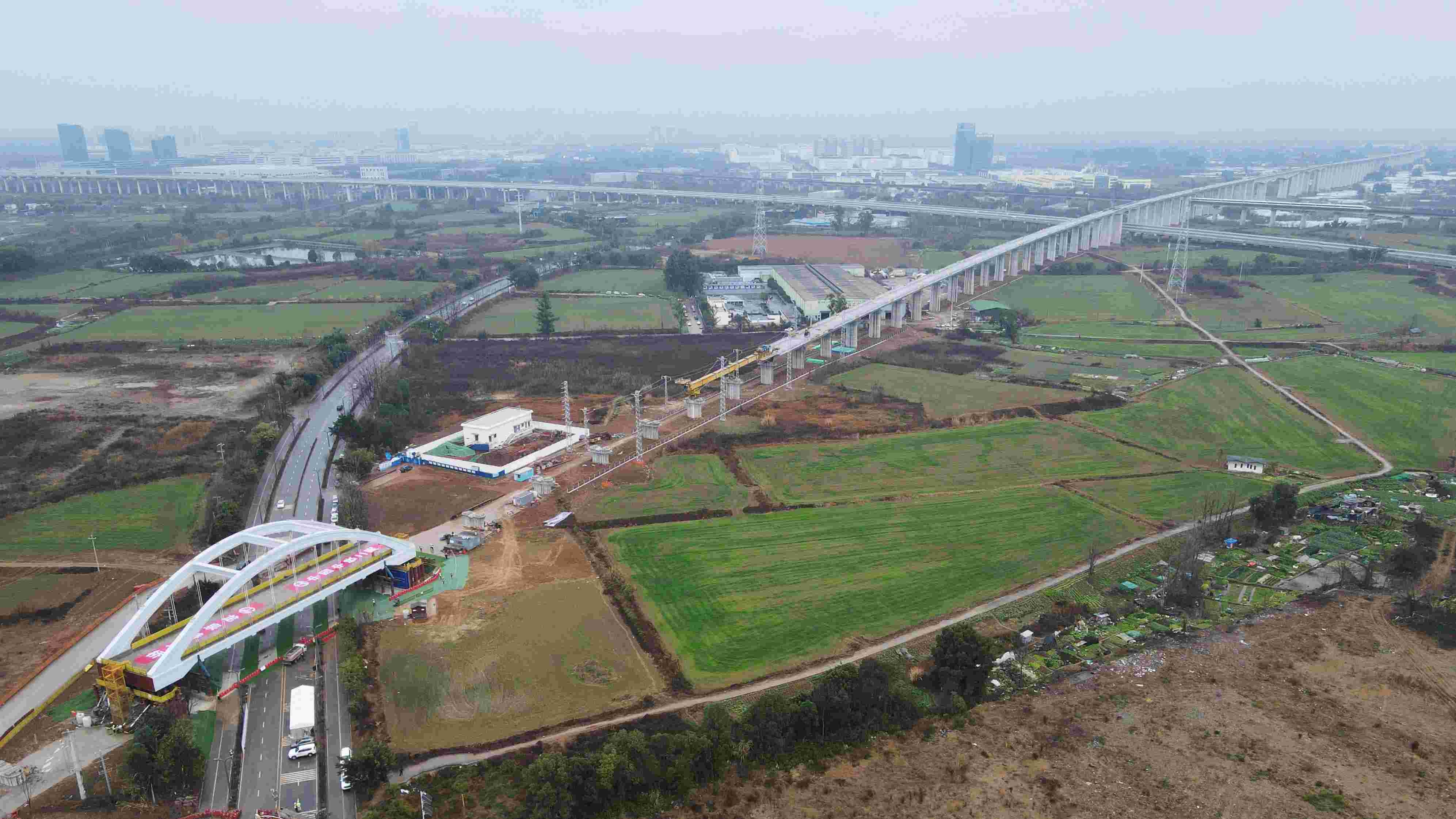 成渝中线高铁是我国“八纵八横”高铁网沿江通道的重要组成部分。线路起自重庆枢纽重庆北站,最终引入成都枢纽成都站,正线全长292公里,设计时速350公里。龙泉特大桥位于成都市,全长14公里,是成渝中线高铁全线最长的桥梁。