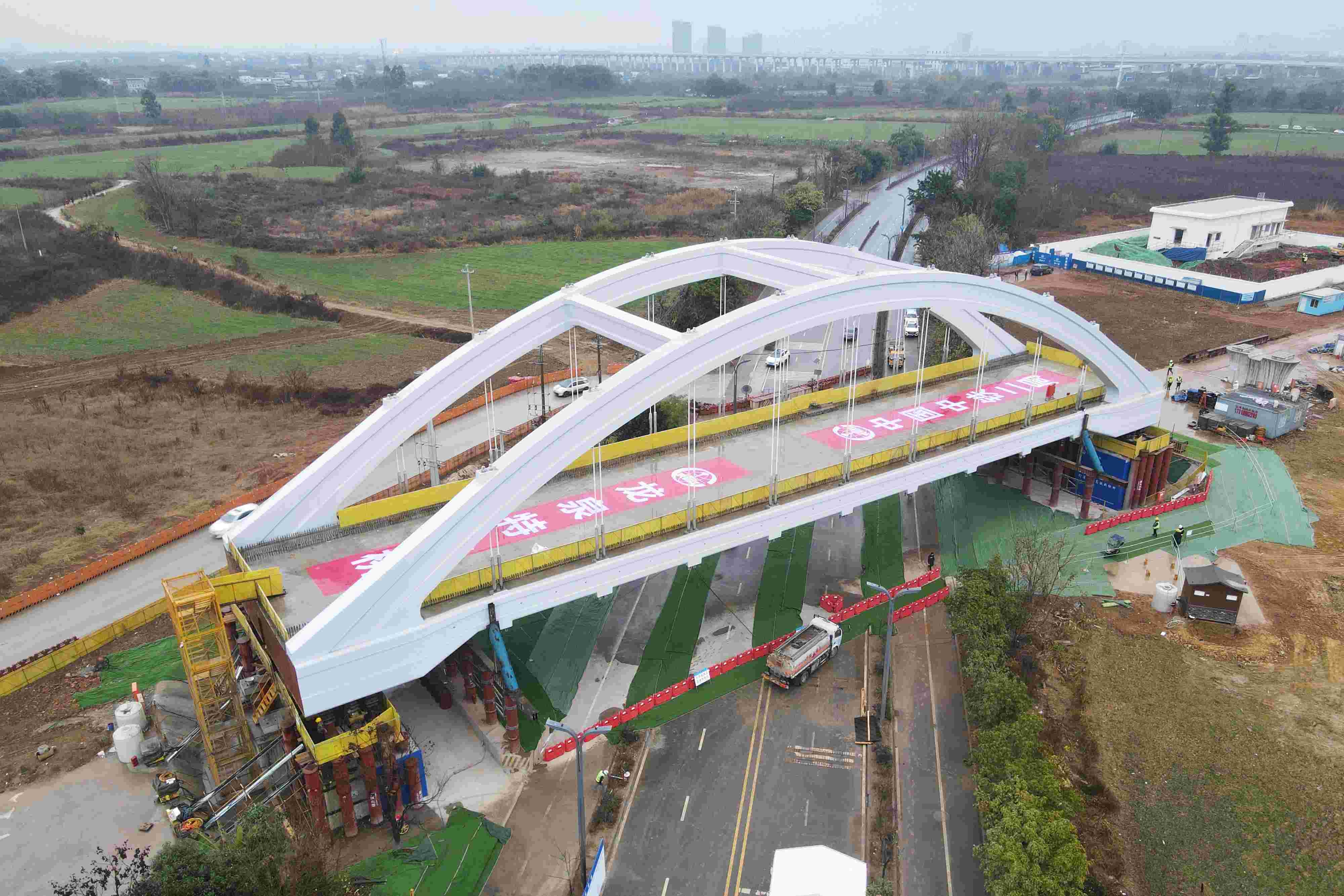 龙泉特大桥在跨越成华区新龙石路时,需同时满足桥下道路通行净空和桥梁接入蜀安隧道的条件。故此,桥址处线路纵坡按-25‰设计逐步下坡,坡度变化显著。该段无法采用高铁连续梁常用的普通箱梁或悬灌连续梁跨越,最终采用1孔72米系杆拱桥,重达6000吨,梁体以搭设高位现浇梁柱式支架方式制作,完成后通过高位落梁实现精准就位。该方式兼具适应大跨度、梁体高度低的特点,可最大限度保证桥下通行净空,在不中断桥下交通的情况下完成梁体施工。