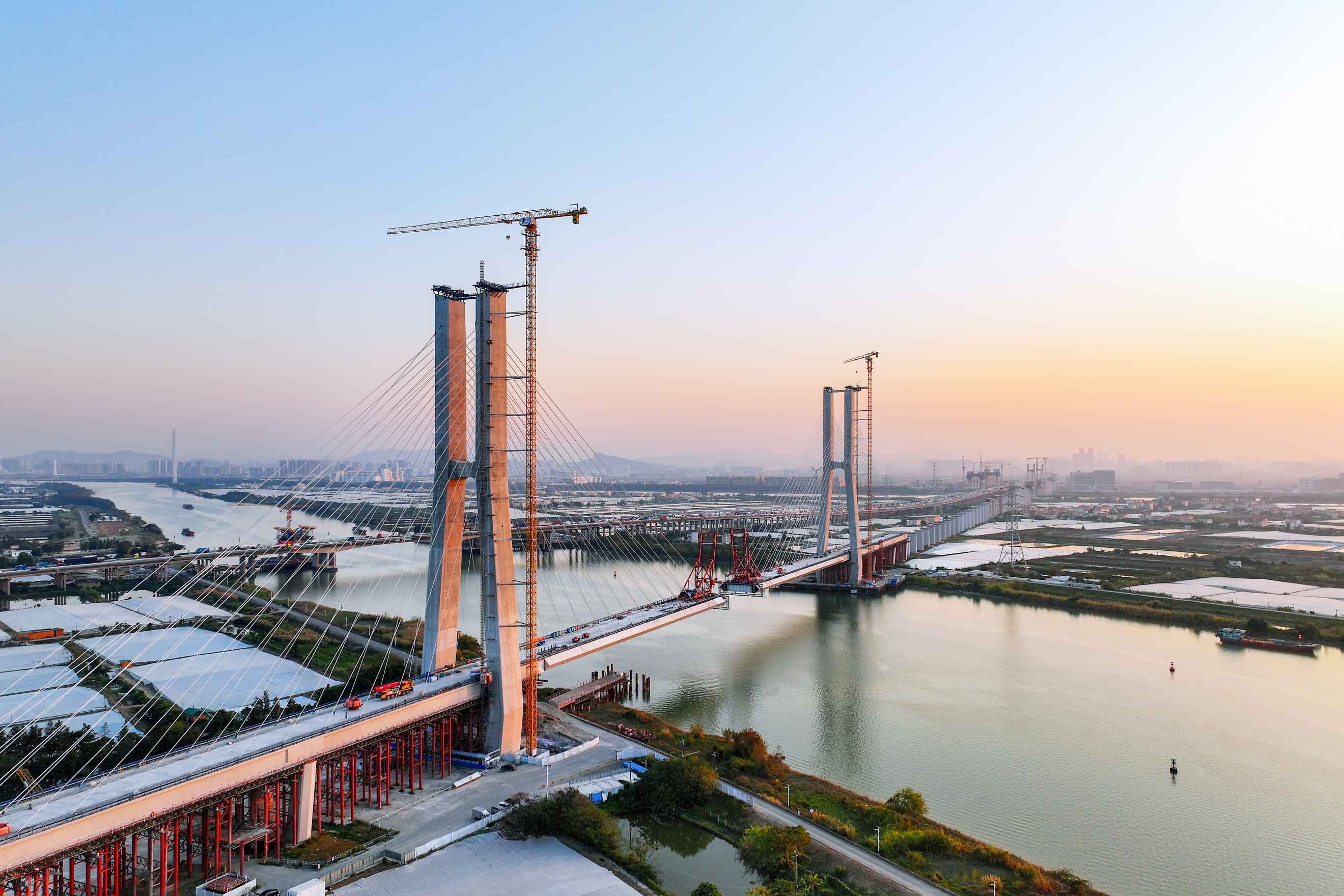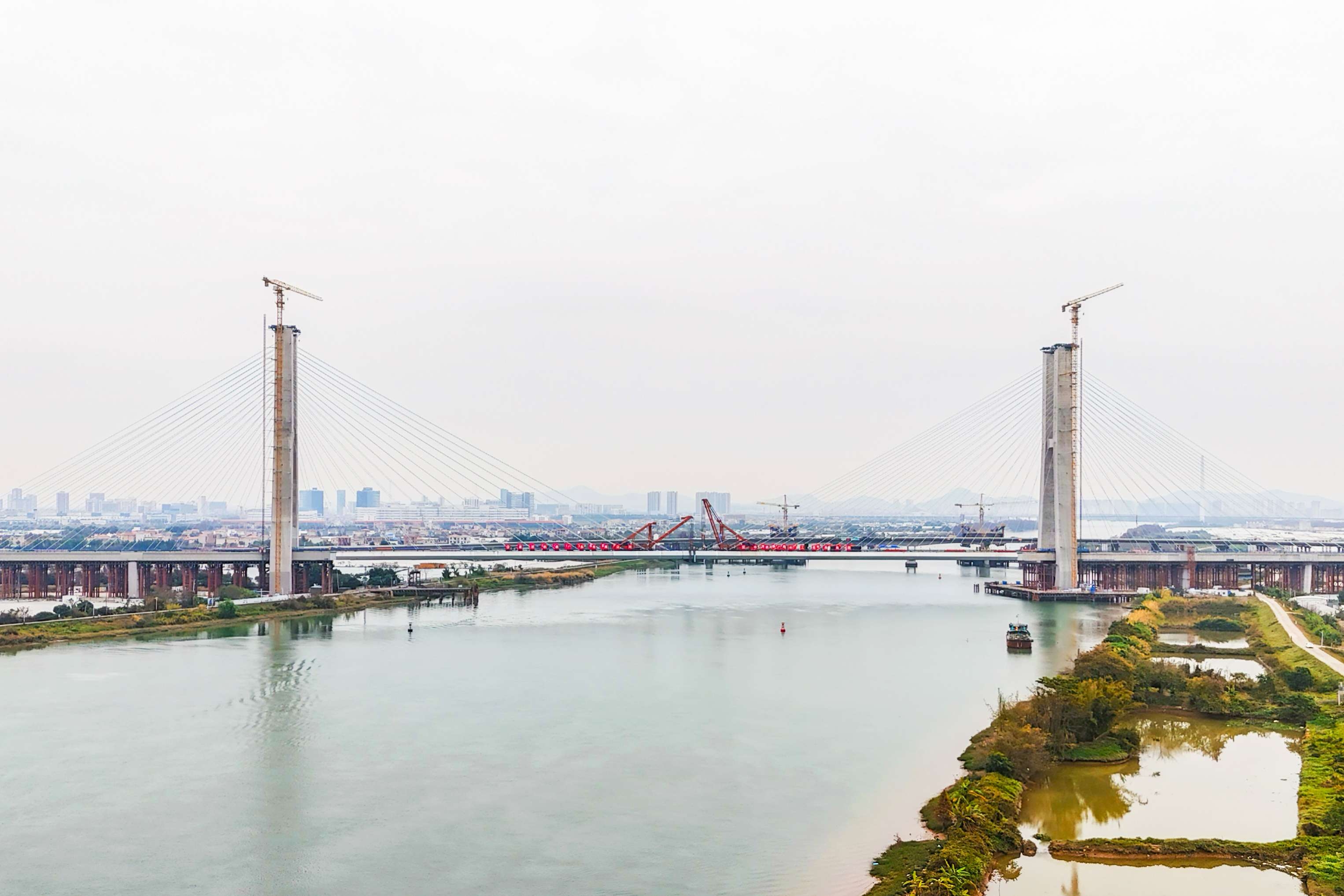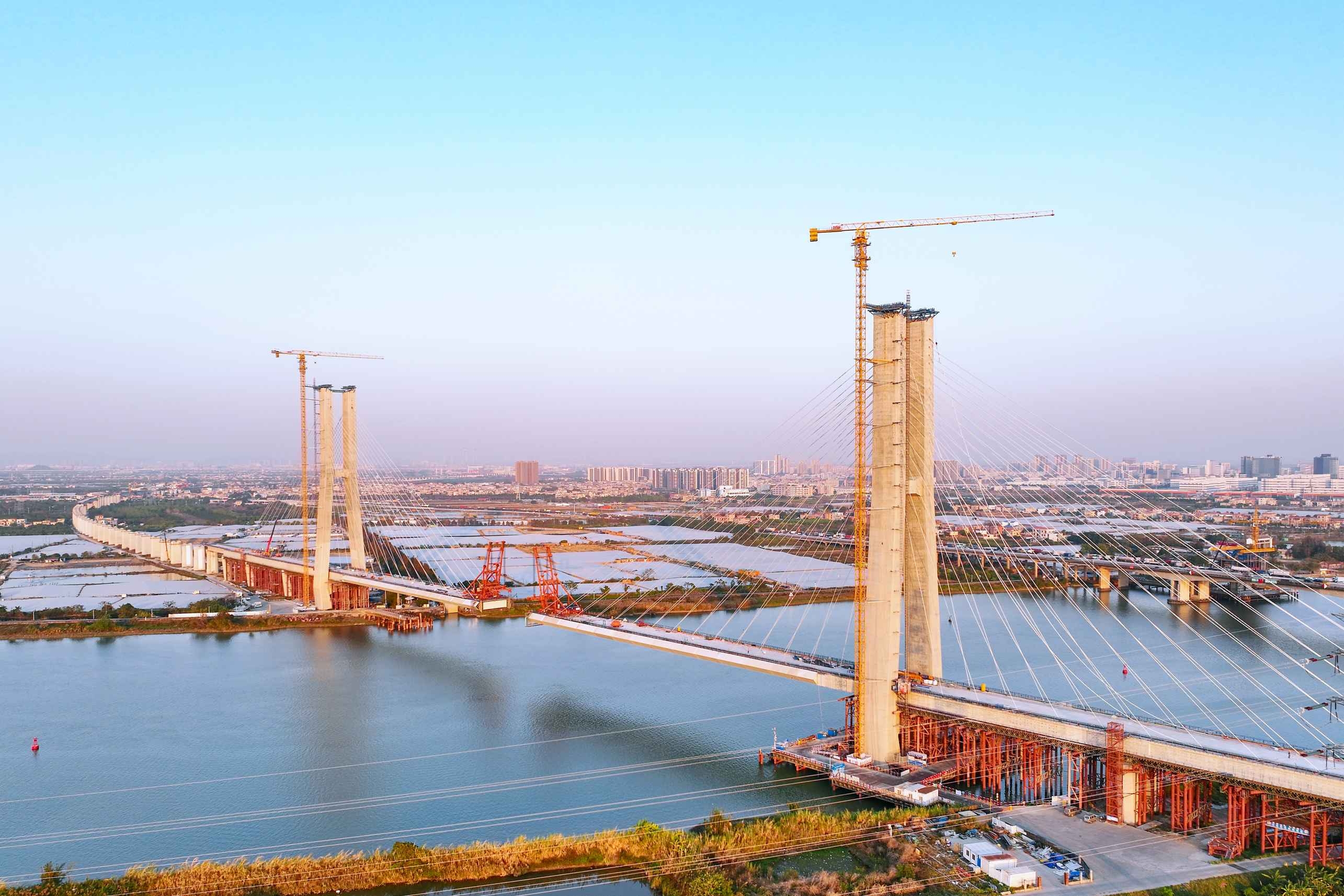 广中江特大桥-鸡鸦水道桥段是深江铁路全线重点控制性工程,位于中山火炬高新区民众街道和港口镇之间,全长6896.19米。其中,跨鸡鸦水道主桥采用双塔双索面混合组合梁斜拉桥结构,全长788.9米,主塔最高达140米,共设64对斜拉索。