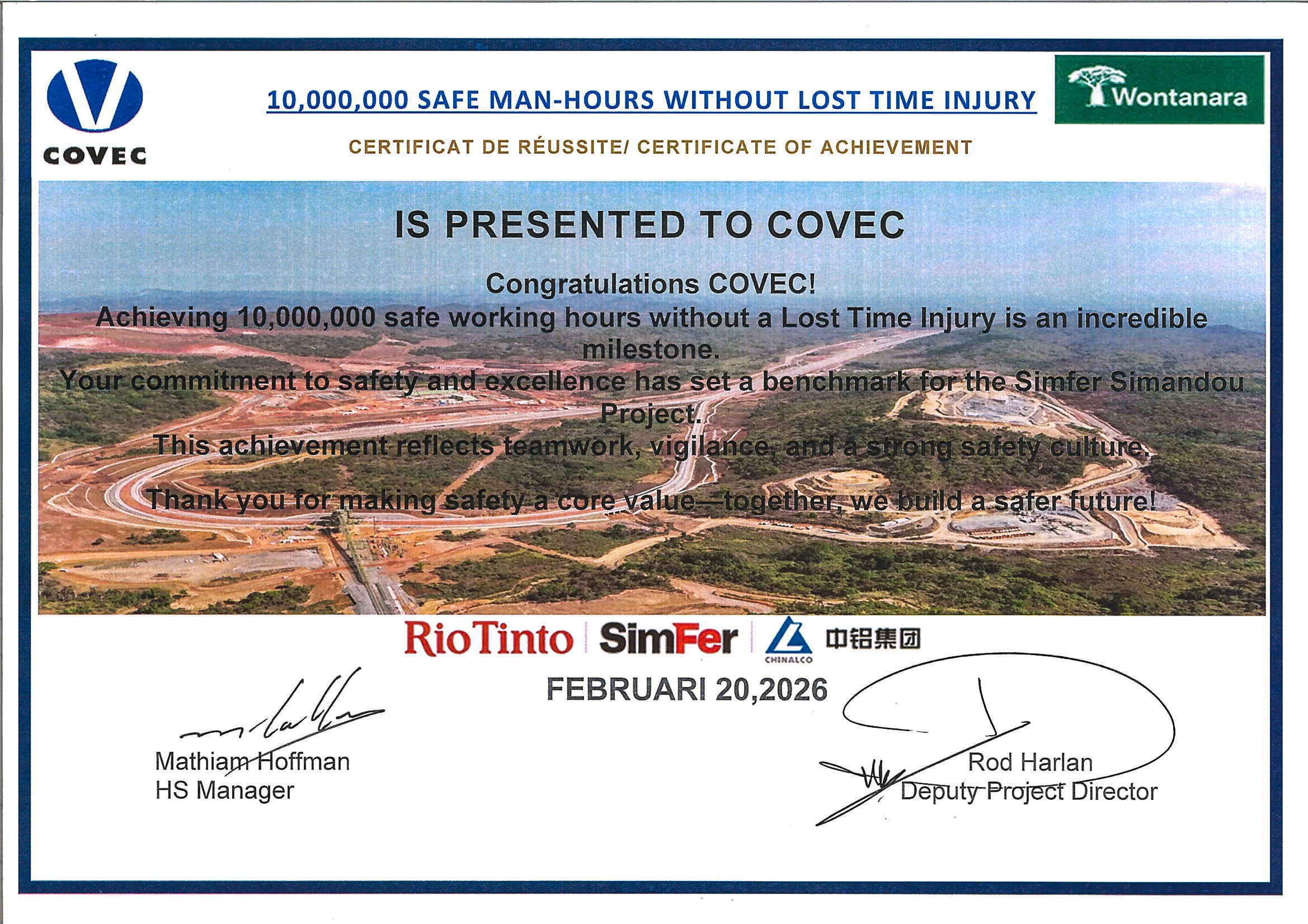 当地时间3月17日,中国中铁旗下中海外荣获几内亚力拓西芒杜项目公司“1000万安全工时无工时损失伤害成就”荣誉证书,成为西芒杜矿区建设中首个达成该安全成就的承包商。