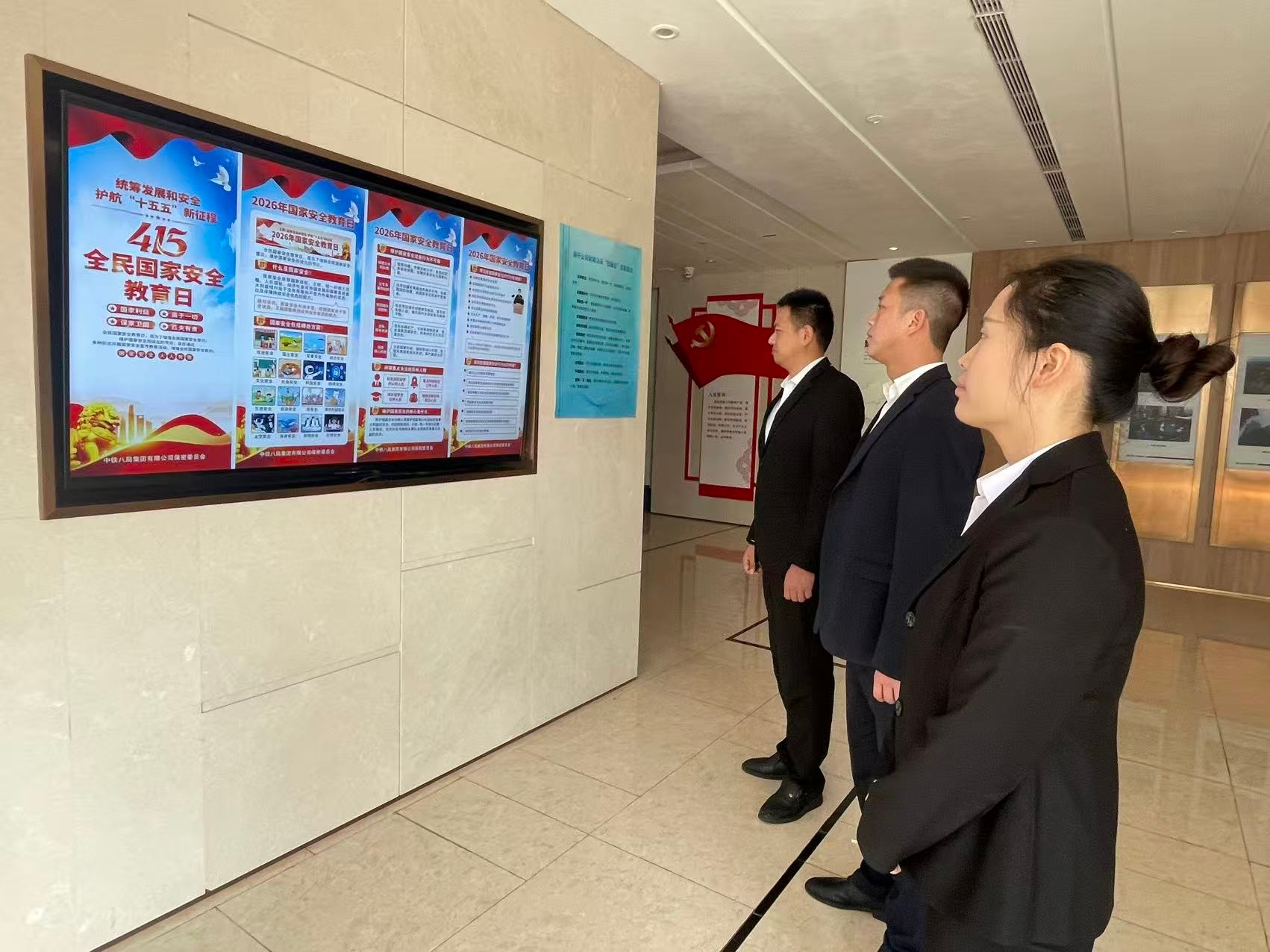 近日,中铁八局房开公司在驻地办公楼电子屏、食堂等场所播放张贴2026年国家安全教育日系列海报,利用LED屏滚动播放国家安全宣传图片资料,并在工作群发布电子宣传册,以直观方式推动国家安全知识入脑入心,营造“国家安全、人人有责”的浓厚氛围。(饶然)