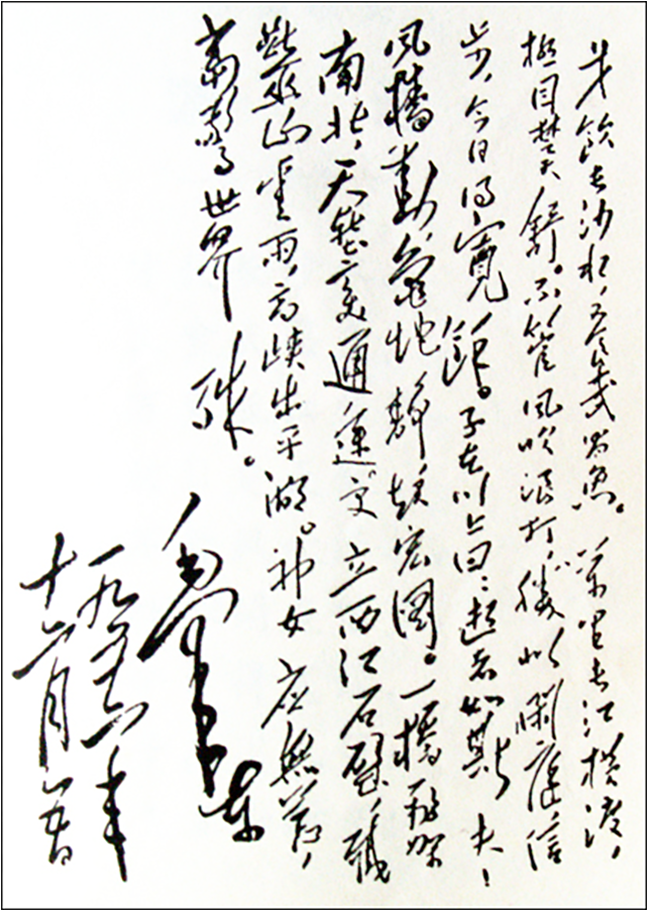 杨在田又拿出纸和笔请毛主席题词。毛主席认真地说:“这可要好好想一想。”王任重说:“主席,您就题‘一桥飞架南北,天堑变通途’嘛。”“到东湖后考虑考虑再写。”毛主席说,随后与大家握手告别。几天后,毛主席派人送来了题词,正是“一桥飞架南北,天堑变通途”。