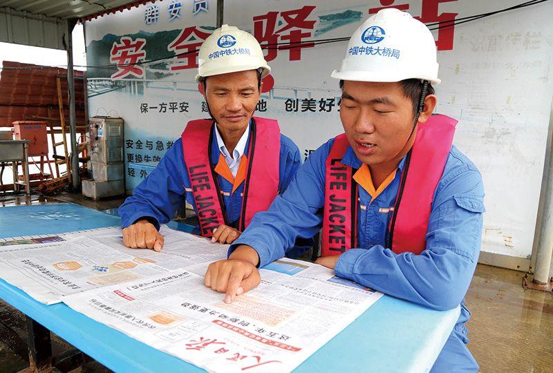 10月29日,中铁大桥局珠机城际金海大桥项目部员工利用工余时间,从报纸上认真学习了解党的十九届五中全会盛况。